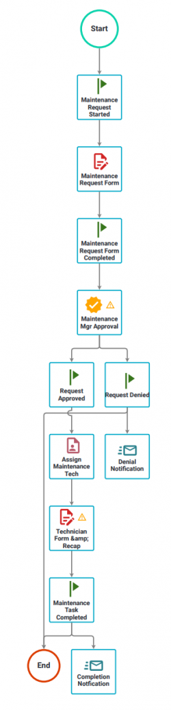 This is our maintenance request process. It’s prebuilt and available to our customers for free download. In this process, a request for maintenance is submitted for approval to the maintenance manager. If approved, a maintenance worker is assigned to handle the task. Once the task is complete, the assigned maintenance worker completes a recap form, which is included in the completion notification.