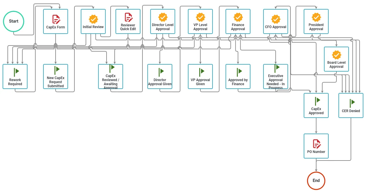 Below is an example of a reasonably simple CapEx Approval Process. Note the multi-step approval process from facility to CFO to CEO. Your process could involve even more steps/logic than this.