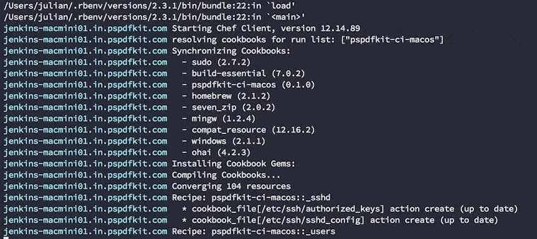 At PSPDFKit we’re currently using 20 Mac minis to run our continuous integration. Manually setting up these machines is a very time consuming and error prone process. Keeping all these machines in sync by hand is almost impossible. That’s why we’re using Chef(opens in a new tab) to describe our infrastructure in code.