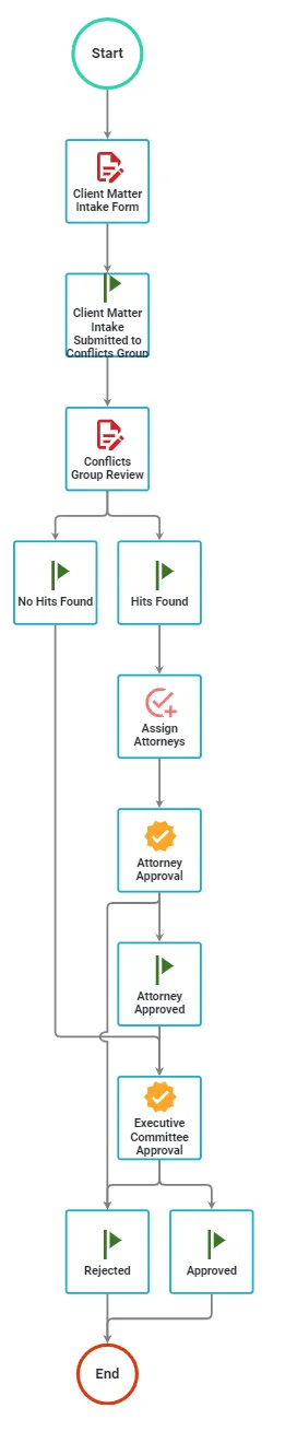 Below is an example of one client onboarding process that is project-based. This organization is a large technology and management consulting firm that needed to streamline the project onboarding process for new clients while ensuring that all the proper steps were taken and accountable. Note the approvals and hand-offs have been automated to ensure a compliant and consistent workflow.