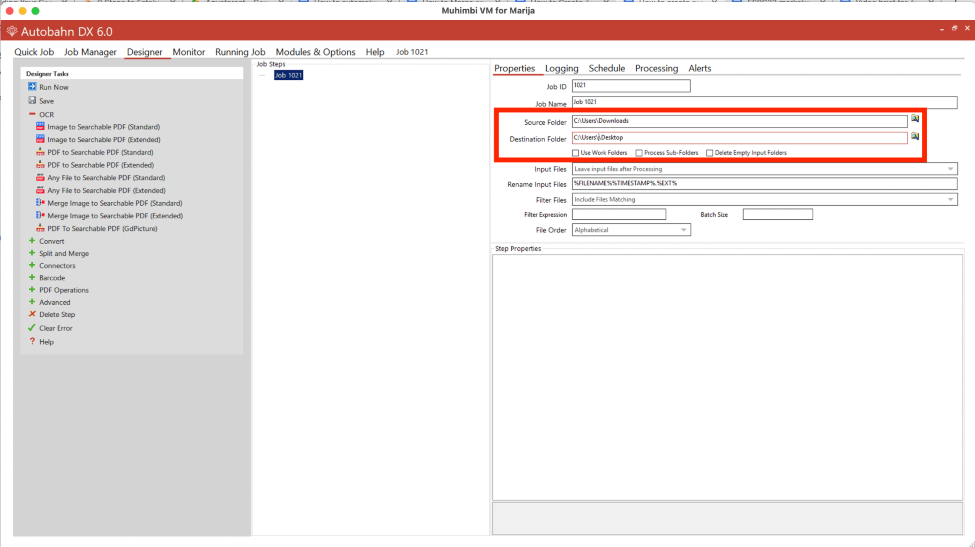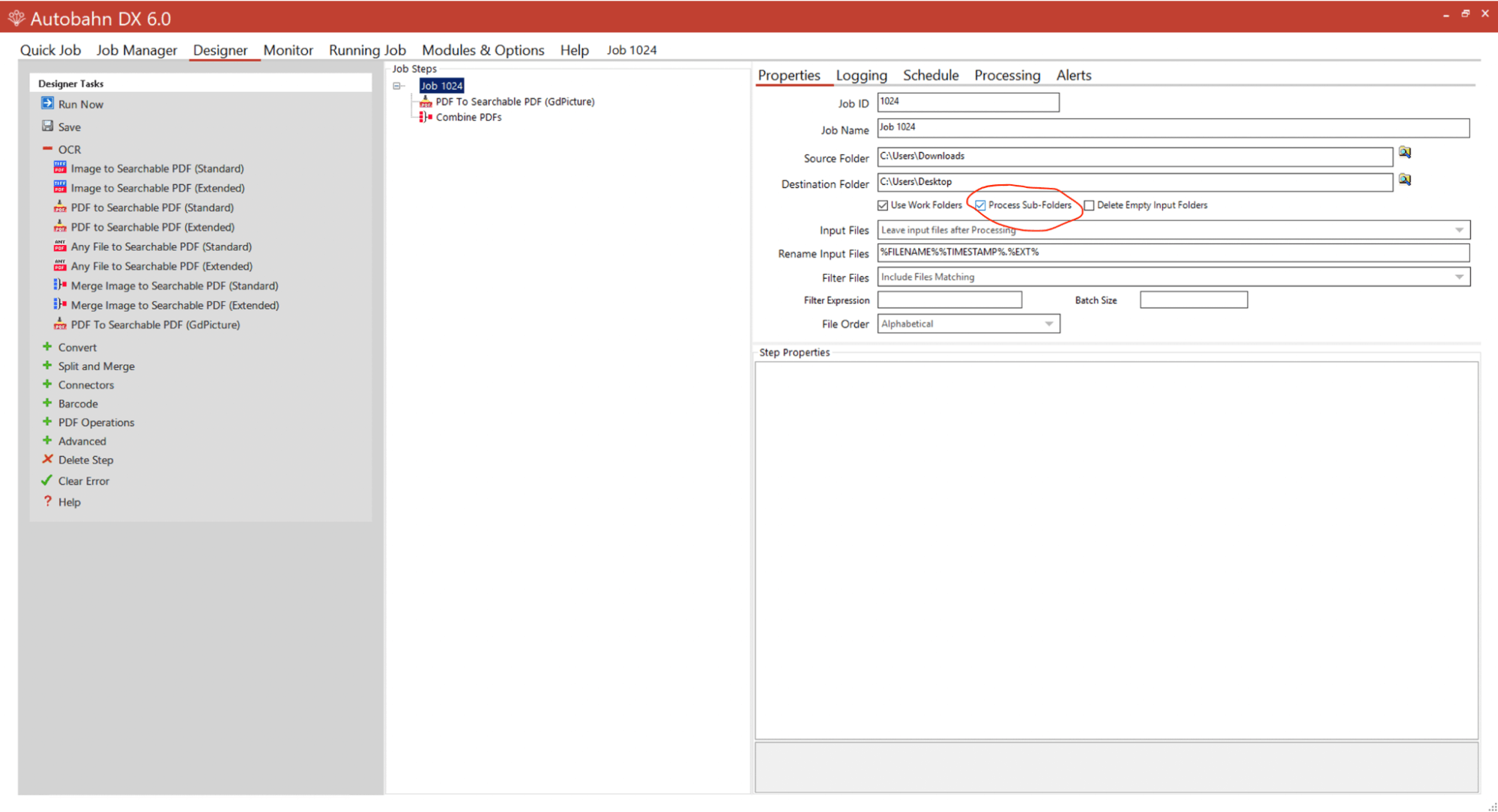 As you want to merge and batch OCR multiple files, you need to have subfolders. For example, one subfolder will contain a set of files you want to merge, the second subfolder will contain another set of files you want to merge, and so on. To enable this option, check the Process Sub-Folders box. That option can be found under the Destination Folder field and next to the Use Work Folders box. Save the job and go to the Job Manager tab. 5. Set up the job to run automatically.