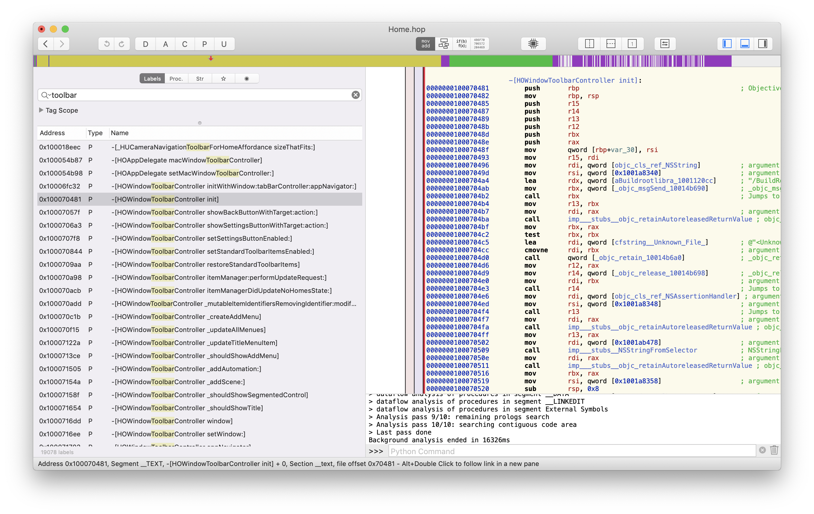 Looking at the toolbar, we’re not quite done here. Being a good Mac citizen means we use the native toolbar, just like Apple’s Home app(opens in a new tab). To see how this is done, I usually do my spelunking(opens in a new tab) with IDA or Hopper — both are great for disassembling and peeking inside Apple’s apps. By opening the Home app in Hopper and searching for “toolbar,” the responsible class was easy to find: