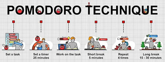 - After 4 Pomodoro sessions, take a more extended break of 15-30 minutes.