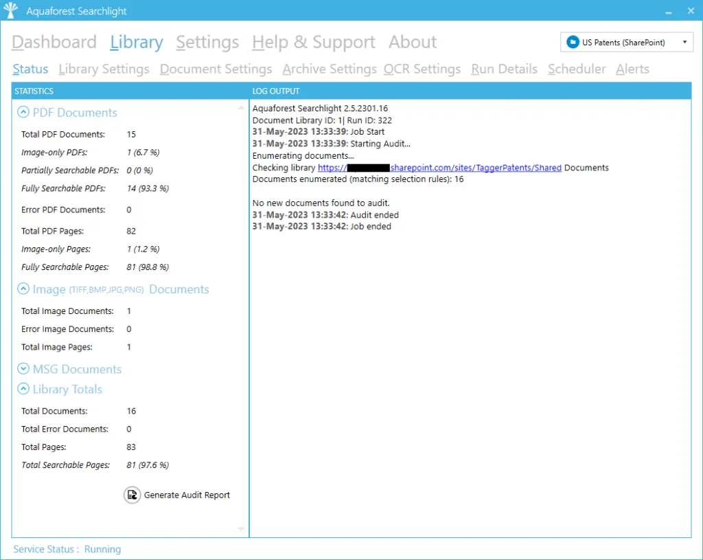 Searchlight offers built-in reporting and a very informative audit report showing the number of image, partially searchable, searchable and error PDFs.
