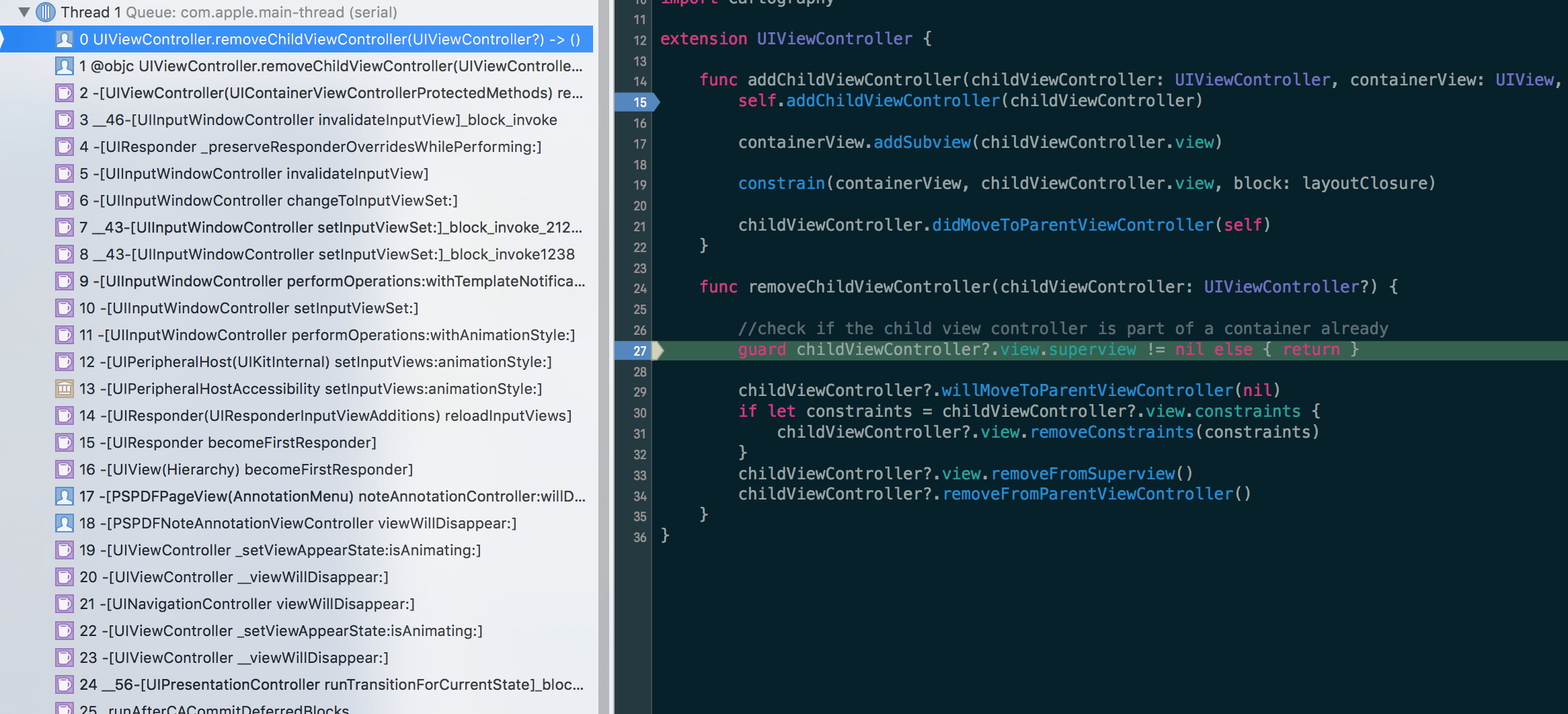 2016-03-24 22:27:18.793 TheApp[45769:6521650] *** Terminating app due to uncaught exception 'NSInvalidArgumentException', reason: '*** -[__NSArrayM insertObject:atIndex:]: object cannot be nil'*** First throw call stack:( 0 CoreFoundation 0x0000000108d95e65 __exceptionPreprocess + 165 1 libobjc.A.dylib 0x0000000109f68deb objc_exception_throw + 48 2 CoreFoundation 0x0000000108c5c8c5 -[__NSArrayM insertObject:atIndex:] + 901 3 UIKit 0x0000000104b8c300 -[UIViewController _addChildViewController:performHierarchyCheck:notifyWillMove:] + 541 4 UIKit 0x000000010534b0bf -[UIInputWindowController changeToInputViewSet:] + 473 5 UIKit 0x0000000105344080 -[UIInputWindowController moveFromPlacement:toPlacement:starting:completion:] + 369 6 UIKit 0x000000010534bf0c -[UIInputWindowController setInputViewSet:] + 983 7 UIKit 0x0000000105343d08 -[UIInputWindowController performOperations:withAnimationStyle:] + 50 8 UIKit 0x000000010504bb15 -[UIPeripheralHost(UIKitInternal) setInputViews:animationStyle:] + 1179 9 UIKit 0x000000011a68cb89 -[UIPeripheralHostAccessibility setInputViews:animationStyle:] + 39 10 UIKit 0x0000000104c0251d -[UIResponder(UIResponderInputViewAdditions) reloadInputViews] + 81 11 UIKit 0x0000000104bff546 -[UIResponder becomeFirstResponder] + 617 12 UIKit 0x0000000104a96c59 -[UIView(Hierarchy) becomeFirstResponder] + 138 13 UIKit 0x0000000105396788 -[UITextView becomeFirstResponder] + 75 14 UIKit 0x0000000104a96c95 -[UIView(Hierarchy) deferredBecomeFirstResponder] + 49 15 UIKit 0x0000000104a96d36 -[UIView(Hierarchy) _promoteSelfOrDescendantToFirstResponderIfNecessary] + 133 16 UIKit 0x0000000104a9709f __45-[UIView(Hierarchy) _postMovedFromSuperview:]_block_invoke + 208 17 UIKit 0x0000000104a96f69 -[UIView(Hierarchy) _postMovedFromSuperview:] + 544 18 UIKit 0x0000000104aa4d8f -[UIView(Internal) _addSubview:positioned:relativeTo:] + 1967 19 UIKit 0x0000000104e68d81 -[UINavigationTransitionView transition:fromView:toView:] + 672 20 UIKit 0x0000000104bcdcf5 -[UINavigationController _startTransition:fromViewController:toViewController:] + 3291 21 UIKit 0x0000000104bce2f1 -[UINavigationController _startDeferredTransitionIfNeeded:] + 890 22 UIKit 0x0000000104bcf3af -[UINavigationController __viewWillLayoutSubviews] + 57 23 UIKit 0x0000000104d75ff7 -[UILayoutContainerView layoutSubviews] + 248 24 UIKit 0x000000011a68f158 -[UILayoutContainerViewAccessibility layoutSubviews] + 43 25 UIKit 0x0000000104aa84a3 -[UIView(CALayerDelegate) layoutSublayersOfLayer:] + 703 26 QuartzCore 0x000000010427359a -[CALayer layoutSublayers] + 146 27 QuartzCore 0x0000000104267e70 _ZN2CA5Layer16layout_if_neededEPNS_11TransactionE + 366 28 QuartzCore 0x0000000104267cee _ZN2CA5Layer28layout_and_display_if_neededEPNS_11TransactionE + 24 29 QuartzCore 0x000000010425c475 _ZN2CA7Context18commit_transactionEPNS_11TransactionE + 277 30 QuartzCore 0x0000000104289c0a _ZN2CA11Transaction6commitEv + 486 31 UIKit 0x0000000104a1cb47 _afterCACommitHandler + 174 32 CoreFoundation 0x0000000108cc1367 __CFRUNLOOP_IS_CALLING_OUT_TO_AN_OBSERVER_CALLBACK_FUNCTION__ + 23 33 CoreFoundation 0x0000000108cc12d7 __CFRunLoopDoObservers + 391 34 CoreFoundation 0x0000000108cb6f2b __CFRunLoopRun + 1147 35 CoreFoundation 0x0000000108cb6828 CFRunLoopRunSpecific + 488 36 GraphicsServices 0x000000010b366ad2 GSEventRunModal + 161 37 UIKit 0x00000001049f1610 UIApplicationMain + 171 38 TheApp 0x0000000101e206e2 main + 114 39 libdyld.dylib 0x000000010aa7192d start + 1)libc++abi.dylib: terminating with uncaught exception of type NSExceptionNotice how this is all UIKit, but triggered by an action in our framework. So we started digging and reading lots and lots of UIKit disassembly to understand what’s happening under the hood. Everything seemed reasonable. Next step was to try and create a sample, so we could report a radar. Has to be UIKit’s fault - right? :)