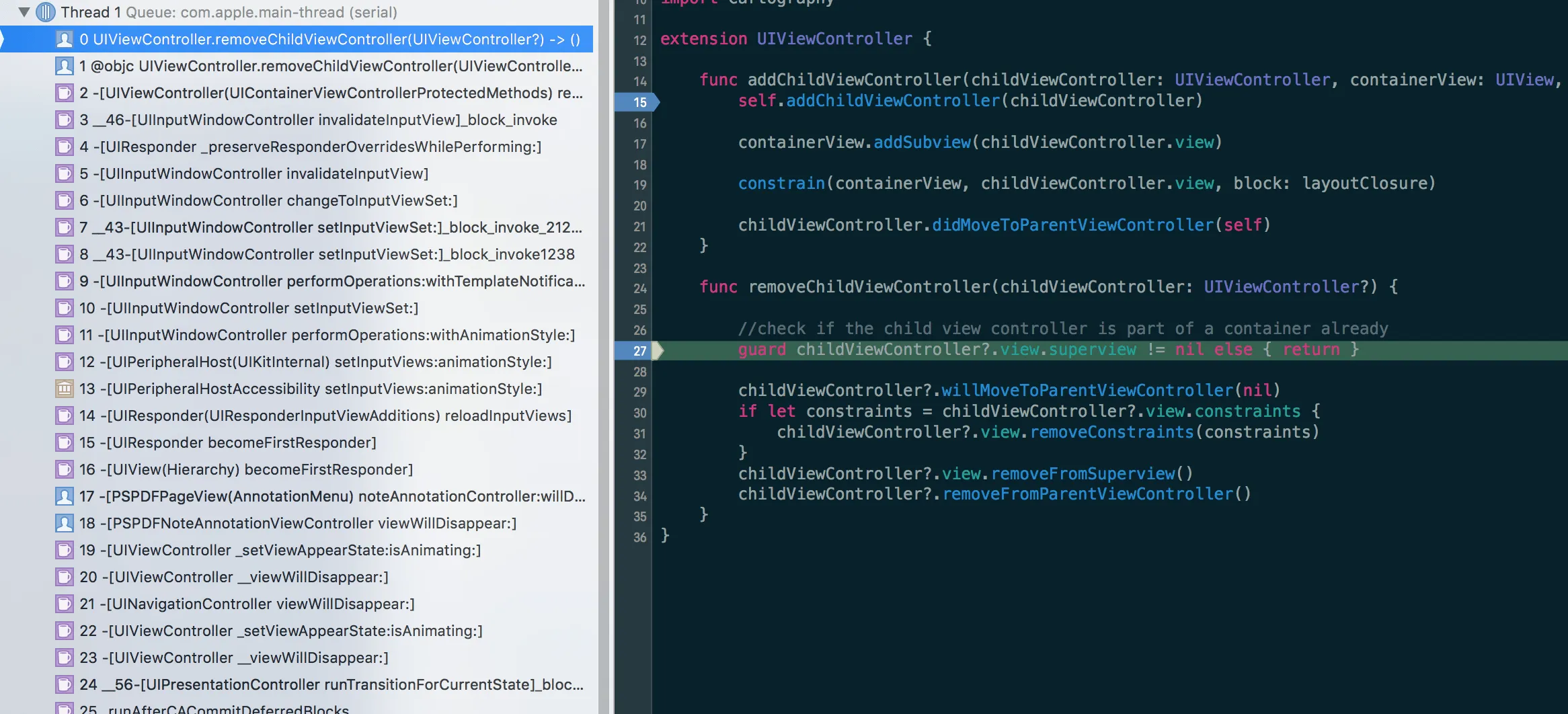 2016-03-24 22:27:18.793 TheApp[45769:6521650] *** Terminating app due to uncaught exception 'NSInvalidArgumentException', reason: '*** -[__NSArrayM insertObject:atIndex:]: object cannot be nil'*** First throw call stack:( 0 CoreFoundation 0x0000000108d95e65 __exceptionPreprocess + 165 1 libobjc.A.dylib 0x0000000109f68deb objc_exception_throw + 48 2 CoreFoundation 0x0000000108c5c8c5 -[__NSArrayM insertObject:atIndex:] + 901 3 UIKit 0x0000000104b8c300 -[UIViewController _addChildViewController:performHierarchyCheck:notifyWillMove:] + 541 4 UIKit 0x000000010534b0bf -[UIInputWindowController changeToInputViewSet:] + 473 5 UIKit 0x0000000105344080 -[UIInputWindowController moveFromPlacement:toPlacement:starting:completion:] + 369 6 UIKit 0x000000010534bf0c -[UIInputWindowController setInputViewSet:] + 983 7 UIKit 0x0000000105343d08 -[UIInputWindowController performOperations:withAnimationStyle:] + 50 8 UIKit 0x000000010504bb15 -[UIPeripheralHost(UIKitInternal) setInputViews:animationStyle:] + 1179 9 UIKit 0x000000011a68cb89 -[UIPeripheralHostAccessibility setInputViews:animationStyle:] + 39 10 UIKit 0x0000000104c0251d -[UIResponder(UIResponderInputViewAdditions) reloadInputViews] + 81 11 UIKit 0x0000000104bff546 -[UIResponder becomeFirstResponder] + 617 12 UIKit 0x0000000104a96c59 -[UIView(Hierarchy) becomeFirstResponder] + 138 13 UIKit 0x0000000105396788 -[UITextView becomeFirstResponder] + 75 14 UIKit 0x0000000104a96c95 -[UIView(Hierarchy) deferredBecomeFirstResponder] + 49 15 UIKit 0x0000000104a96d36 -[UIView(Hierarchy) _promoteSelfOrDescendantToFirstResponderIfNecessary] + 133 16 UIKit 0x0000000104a9709f __45-[UIView(Hierarchy) _postMovedFromSuperview:]_block_invoke + 208 17 UIKit 0x0000000104a96f69 -[UIView(Hierarchy) _postMovedFromSuperview:] + 544 18 UIKit 0x0000000104aa4d8f -[UIView(Internal) _addSubview:positioned:relativeTo:] + 1967 19 UIKit 0x0000000104e68d81 -[UINavigationTransitionView transition:fromView:toView:] + 672 20 UIKit 0x0000000104bcdcf5 -[UINavigationController _startTransition:fromViewController:toViewController:] + 3291 21 UIKit 0x0000000104bce2f1 -[UINavigationController _startDeferredTransitionIfNeeded:] + 890 22 UIKit 0x0000000104bcf3af -[UINavigationController __viewWillLayoutSubviews] + 57 23 UIKit 0x0000000104d75ff7 -[UILayoutContainerView layoutSubviews] + 248 24 UIKit 0x000000011a68f158 -[UILayoutContainerViewAccessibility layoutSubviews] + 43 25 UIKit 0x0000000104aa84a3 -[UIView(CALayerDelegate) layoutSublayersOfLayer:] + 703 26 QuartzCore 0x000000010427359a -[CALayer layoutSublayers] + 146 27 QuartzCore 0x0000000104267e70 _ZN2CA5Layer16layout_if_neededEPNS_11TransactionE + 366 28 QuartzCore 0x0000000104267cee _ZN2CA5Layer28layout_and_display_if_neededEPNS_11TransactionE + 24 29 QuartzCore 0x000000010425c475 _ZN2CA7Context18commit_transactionEPNS_11TransactionE + 277 30 QuartzCore 0x0000000104289c0a _ZN2CA11Transaction6commitEv + 486 31 UIKit 0x0000000104a1cb47 _afterCACommitHandler + 174 32 CoreFoundation 0x0000000108cc1367 __CFRUNLOOP_IS_CALLING_OUT_TO_AN_OBSERVER_CALLBACK_FUNCTION__ + 23 33 CoreFoundation 0x0000000108cc12d7 __CFRunLoopDoObservers + 391 34 CoreFoundation 0x0000000108cb6f2b __CFRunLoopRun + 1147 35 CoreFoundation 0x0000000108cb6828 CFRunLoopRunSpecific + 488 36 GraphicsServices 0x000000010b366ad2 GSEventRunModal + 161 37 UIKit 0x00000001049f1610 UIApplicationMain + 171 38 TheApp 0x0000000101e206e2 main + 114 39 libdyld.dylib 0x000000010aa7192d start + 1)libc++abi.dylib: terminating with uncaught exception of type NSExceptionNotice how this is all UIKit, but triggered by an action in our framework. So we started digging and reading lots and lots of UIKit disassembly to understand what's happening under the hood. Everything seemed reasonable. Next step was to try and create a sample, so we could report a radar. Has to be UIKit's fault - right? :)