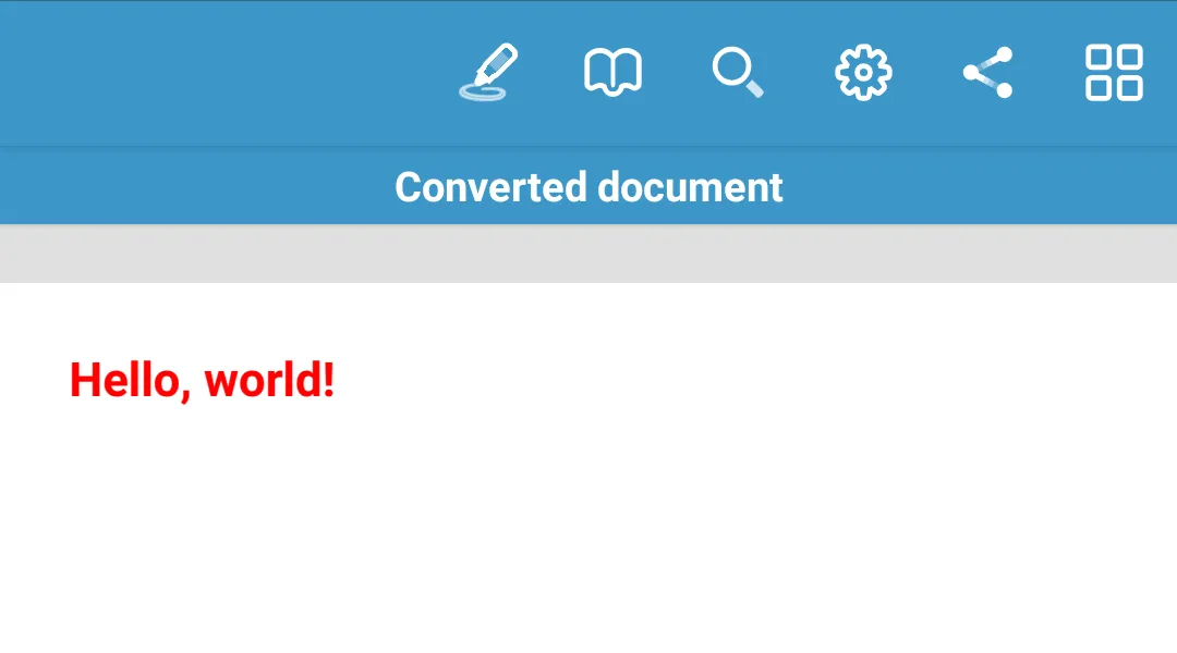 HtmlToPdfConverter.fromHtmlString(context, html) // Configure title for the created document. .title("Converted document") // Perform the conversion. .convertToPdfAsync(outputFile) // Subscribe to the conversion result. .subscribe({ // Open and process the converted document. val document = PdfDocumentLoader.openDocument(context, Uri.fromFile(outputFile)) }, { // Handle the error. })final String html ="<html>\n" +" <head>\n" +" <style type=\"text/css\">\n" +" h1 {\n" +" color: red;\n" +" }\n" +" </style>\n" +" </head>\n" +" <body>\n" +" <h1>Hello, world!</h1>\n" +" </body>\n" +"</html>";