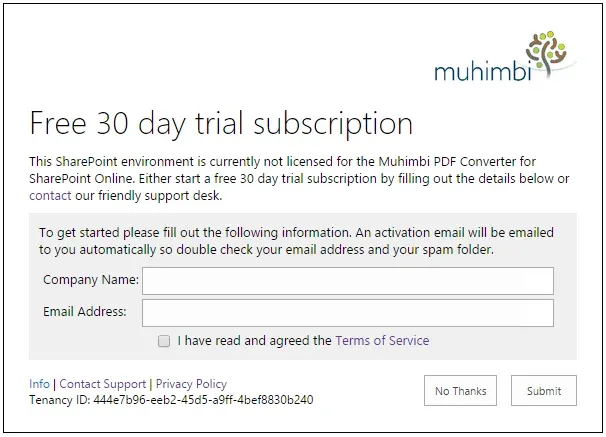 If the trial has already been installed on the destination SharePoint environment then the easiest way to retrieve the Tenancy ID is to try and convert a file using the Document Converter's SharePoint user interface. If your trial has expired then you will find the Tenancy ID at the bottom of the message. If your trial is still active then click the Muhimbi Document Converter for SharePoint Online link at the very top of the browser window. The Tenancy ID is located at the bottom-right of the page.