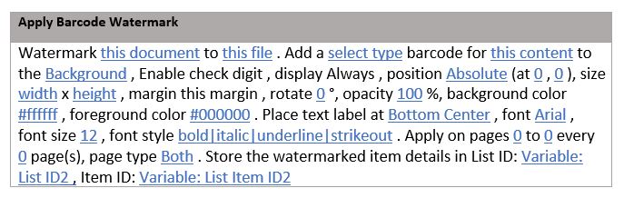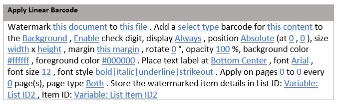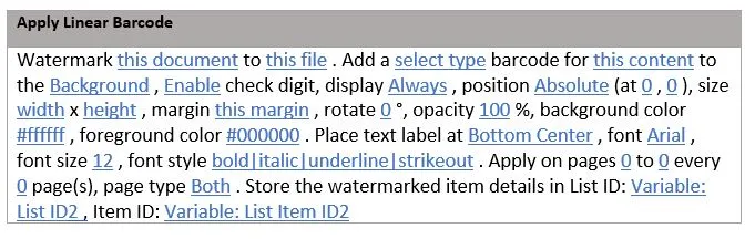 Easily add barcodes as watermarks to your documents using the Add Linear Barcode workflow action. This feature supports a wide range of barcode types, making it versatile for document tracking, auditing, or inventory management.