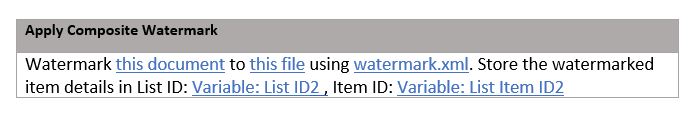 <text hPosition="optional (absolute, random, left, center, right)" ... rest omitted> Your content goes here, use a CDATA section if needed.</text>SharePoint Designer lookup variables are fully supported, enabling dynamic information from workflow variables or the item columns to be embedded directly into the watermark.