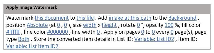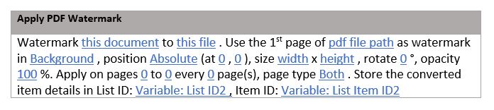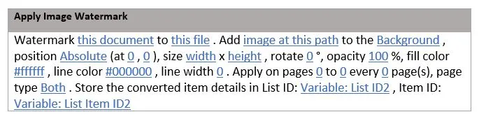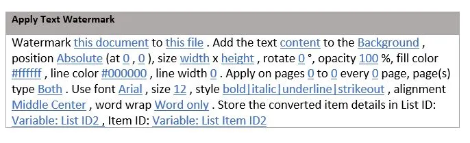 this document— Specifies the document to apply the watermark to. In most workflows, selecting Current Item is sufficient, but certain scenarios may require referencing a different item. Ensure the document’s file type, such as PDF, DOCX, XLSX, or PPTX, is supported.this file— Defines the name and location of the watermarked file. Leave this field blank to overwrite the original file with the watermarked version. Alternatively, specify a path (including the Document Library and folder name) to save the watermarked file in a separate location, e.g.shared documents/watermarked files/confidential.pdf.List ID— The ID of the list where the watermarked file is saved. This can be used later in the workflow to perform additional operations on the file, such as check in or checkout.Item ID— The ID of the watermarked file, which can be used in conjunction with the List ID for additional workflow tasks.