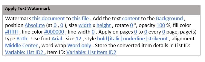 In SharePoint Designer, this workflow action is called Add Text watermark to Document, and it includes the following parameters.