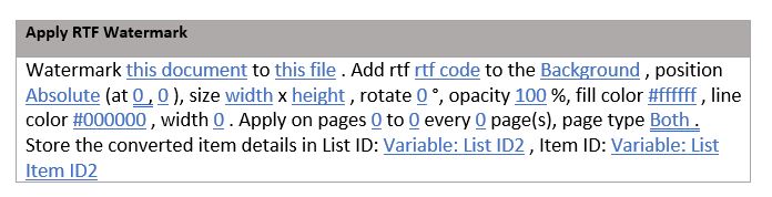 }In SharePoint Designer, this workflow action is called Add RTF watermark to Document, and it includes the following parameters.