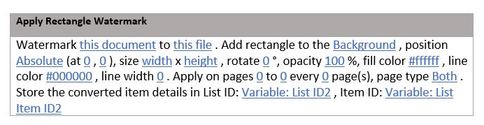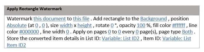 Add a simple rectangle as a watermark to your document using the Add Rectangle to Document workflow action. This option allows you to define the size, position, and appearance of the rectangle. The parameters are as follows.