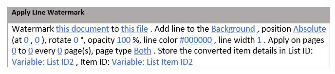 Use the Add Line to Document workflow action to add a line as a watermark. This is ideal for creating dividing elements or emphasizing specific sections within a document. The parameters are as follows.