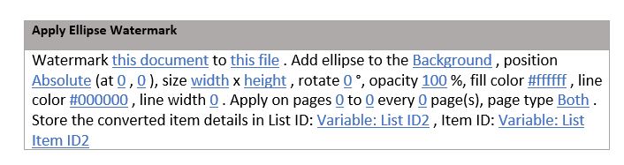 Easily add a circle or ellipse as a watermark using the Add Ellipse to Document workflow action. Customize the dimensions, position, and style of the ellipse to match your needs. The parameters are as follows.