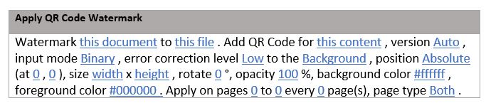 Add various QR codes to documents using the QR code watermark element, which is perfect for embedding document IDs or any other SharePoint metadata.