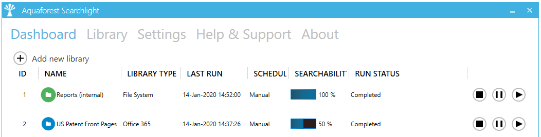 All Document Searchability libraries are displayed in the Dashboard as shown below and the various settings associated with one can be accessed by double-clicking on it.