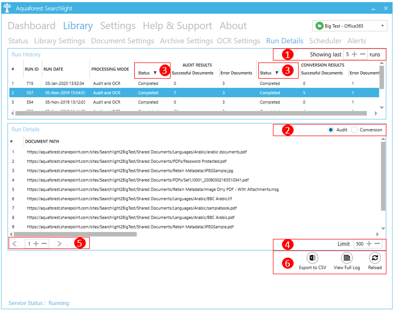 icon next to them can be filtered. You can filter the Searchability status to only display documents that errored during Audit or OCR (Conversion). - You can limit the number of documents to display per page. You need to click on the Reload button after updating this value.