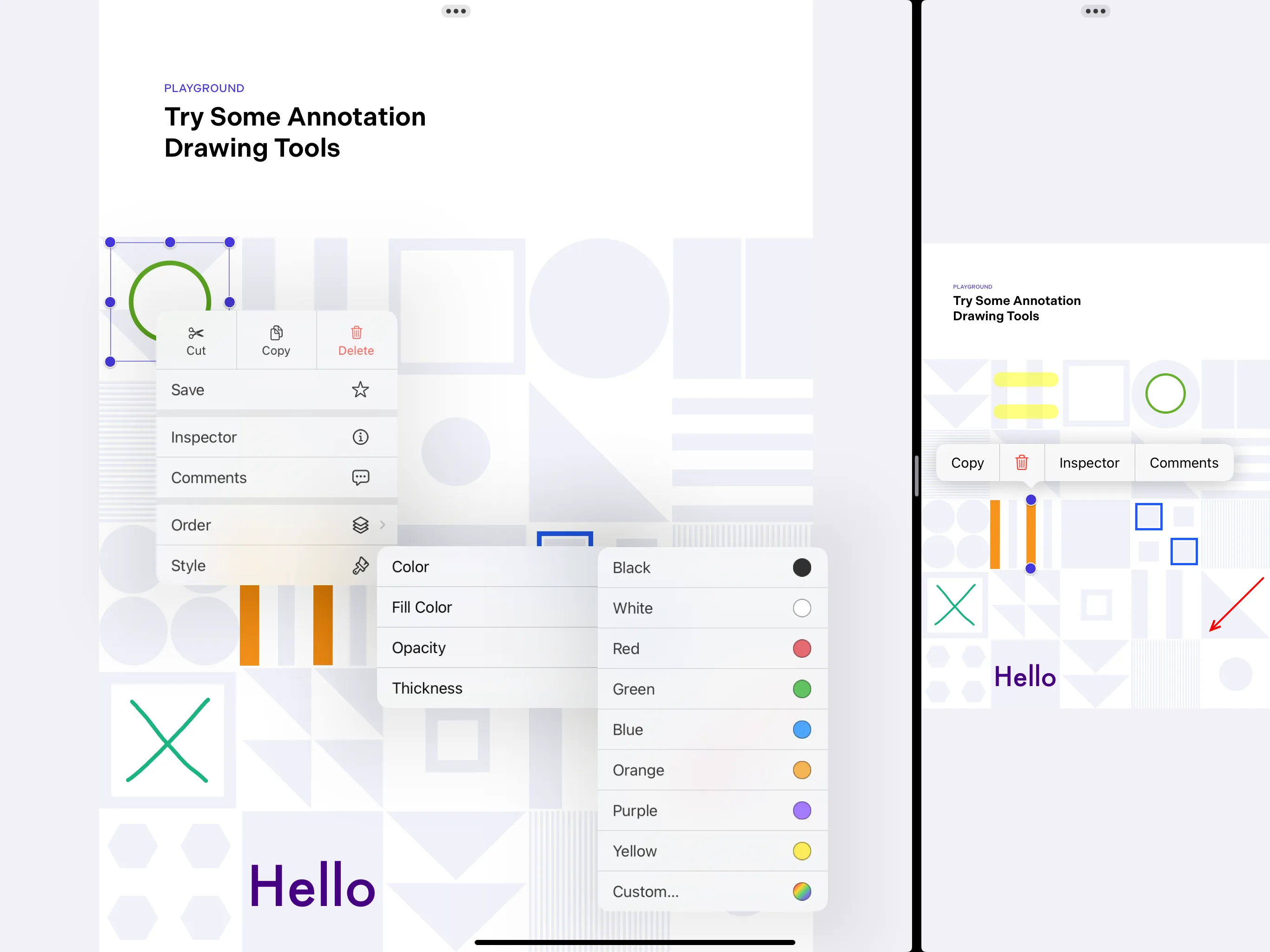 // Before this update.let targetRect = pageView.convert(annotation.boundingBox, from: pageView.pdfCoordinateSpace)pageView.showMenu(for: [annotation], targetRect: targetRect, option: .menuOnly, animated: true)// After this update.pageView.select(annotations: [annotation], presentMenu: true, animated: true)Customizing the annotation creation menu