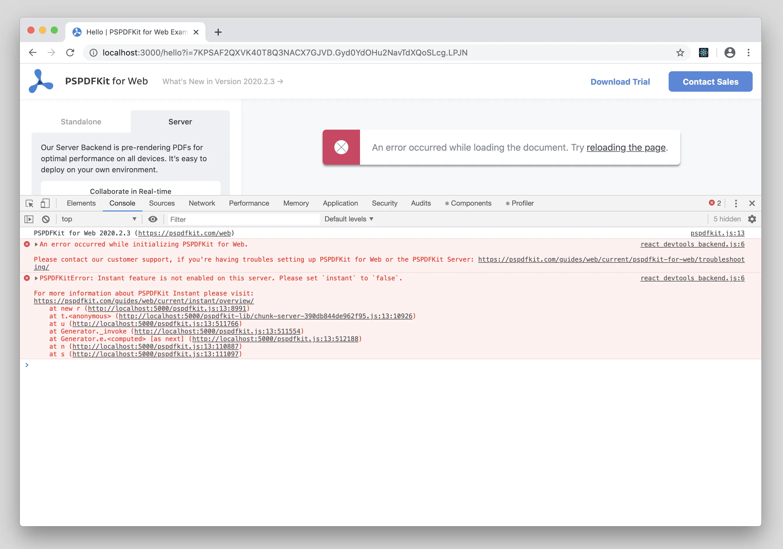 Error message: PSPDFKitError: Instant feature is not enabled on this server. please set instant to false