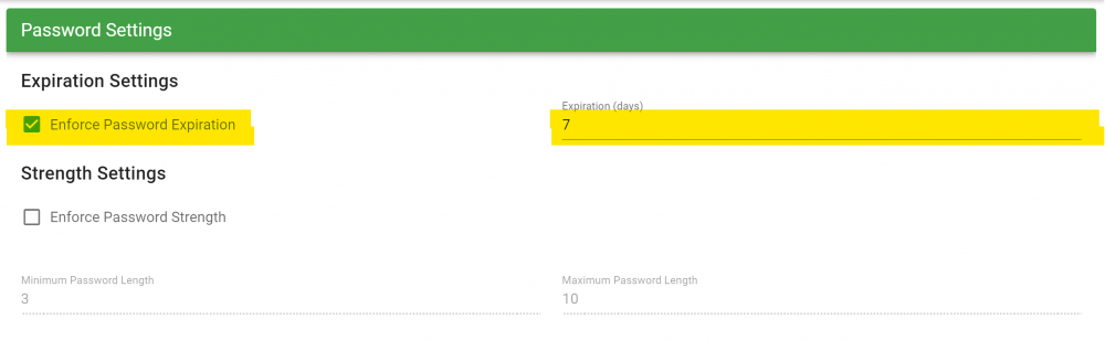 Next under “Password Settings” click the option “Enforce Password Expiration” and select the amout of days for the expiration. Then, make sure to save at the bottom.