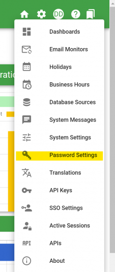 In order to force a user to change their password the next time they login, under the settings wheel on the top right navigation bar, choose “Password Settings”.
