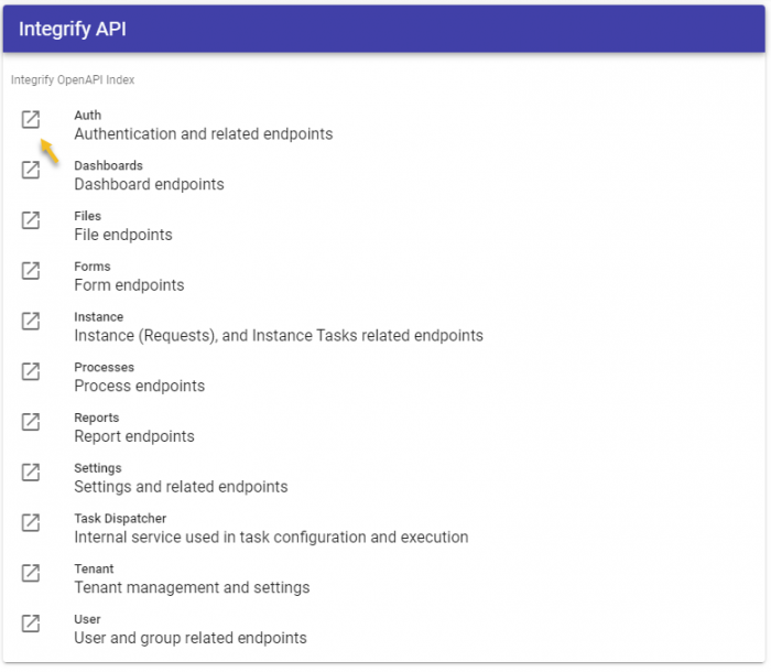 Legacy API information can be found at developer.integrify.com/rest/docs(opens in a new tab). New functions have been added to this version, all of which are documented within the application itself. Refer to the screenshot below for the link to the API documentation.