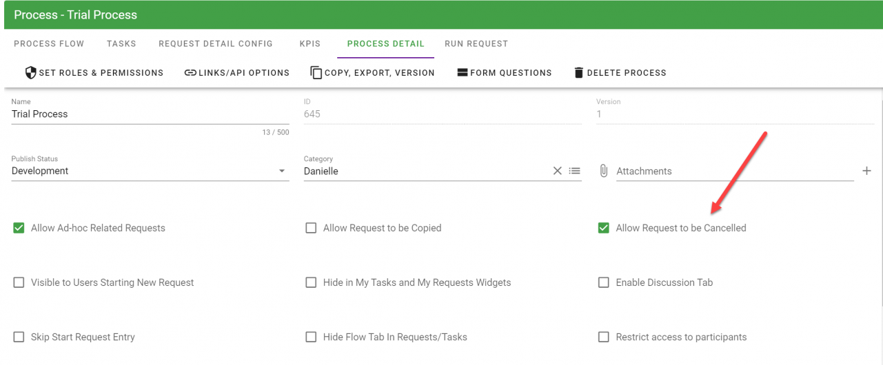 To enable the Cancel Request option, go to Processes under Administration, and open the process that needs this feature. Click the Process Detail section and find the Allow Request to be Cancelled button and toggle it on.