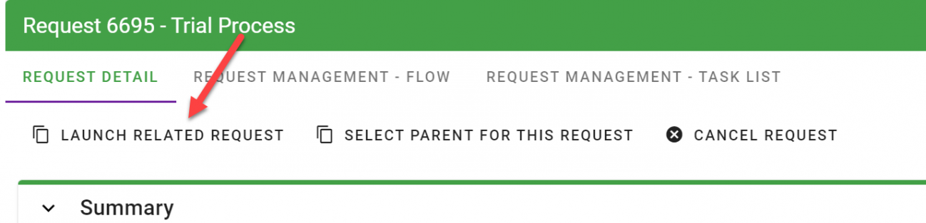 Users can choose to launch a request as a child to the request that is being viewed or choose an existing request as a parent of the request being viewed.