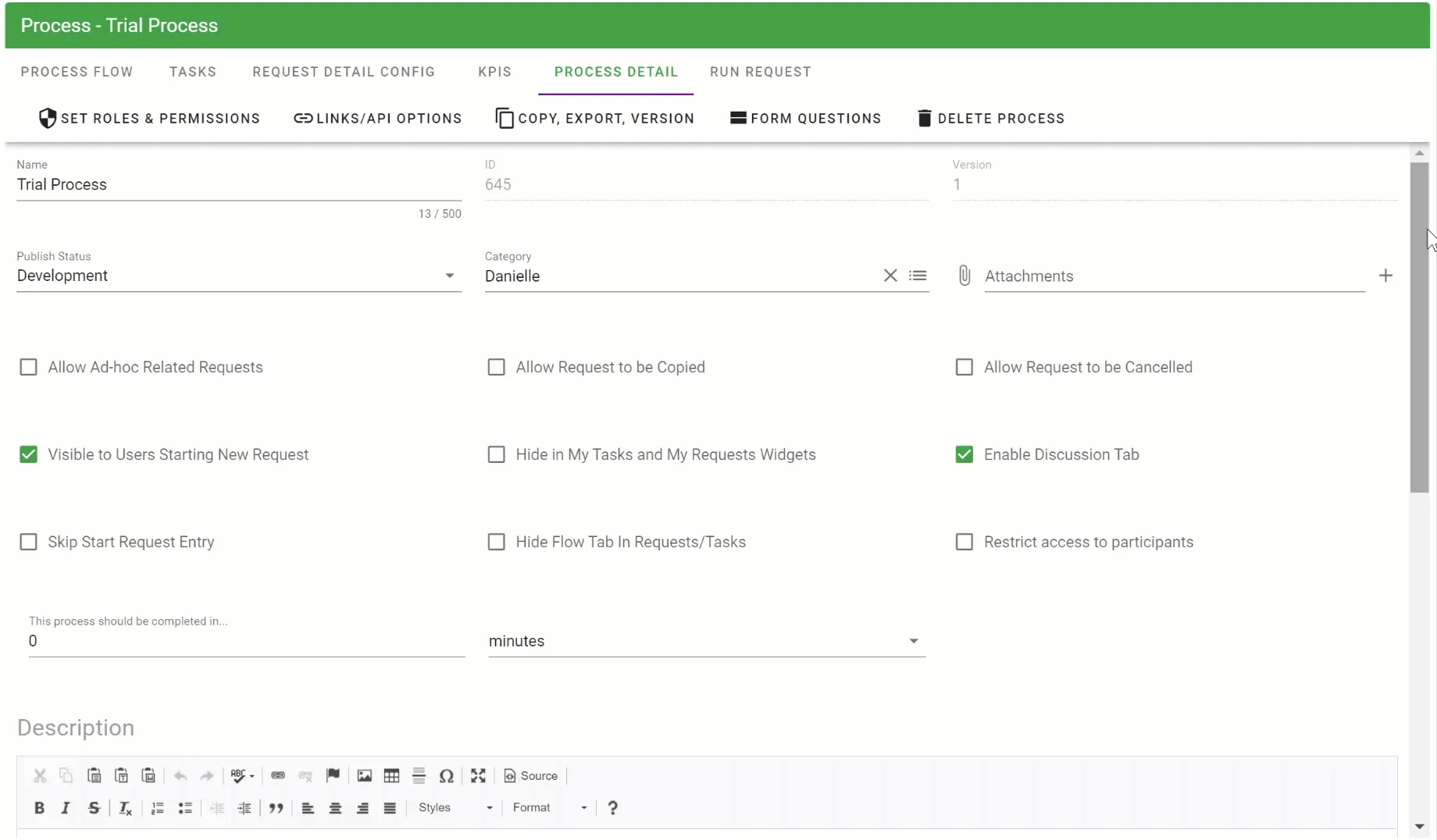 The Process Detail tab of any process defined within Integrify lets you edit basic process settings, copy a process, make a version of an existing process, export a process or delete a process entirely.