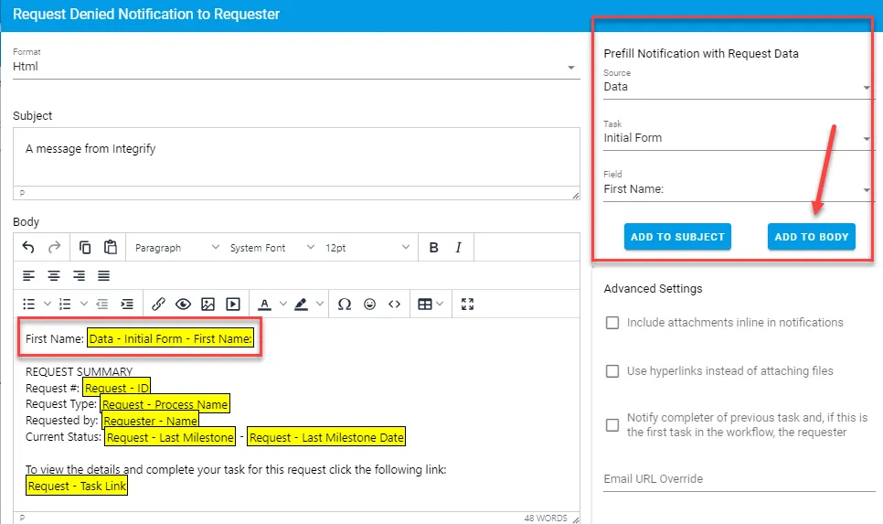 Any item you see highlighted in a yellow box indicates a special token that Integrify will use when email is generated as the task is executing. By default, you will see boxes such as Request – ID or Request – Process Name. These individual boxes will be replaced with the appropriate information based on the context of the request as it is executing.