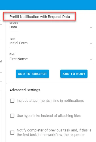 To insert a custom item, start by selecting your Source value from the Prefill Notification with Request Data area on the upper right-hand side of the Notification Settings screen:
