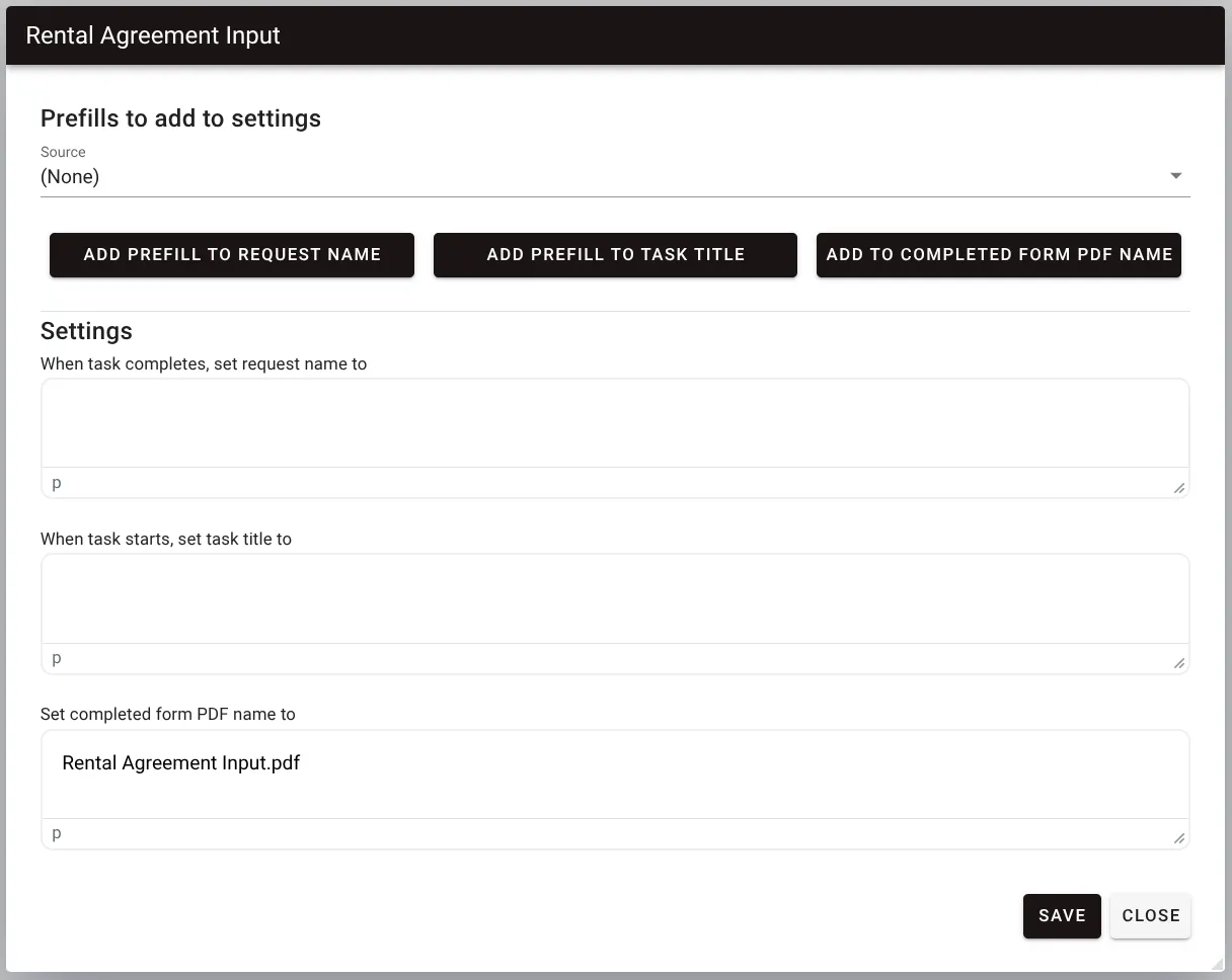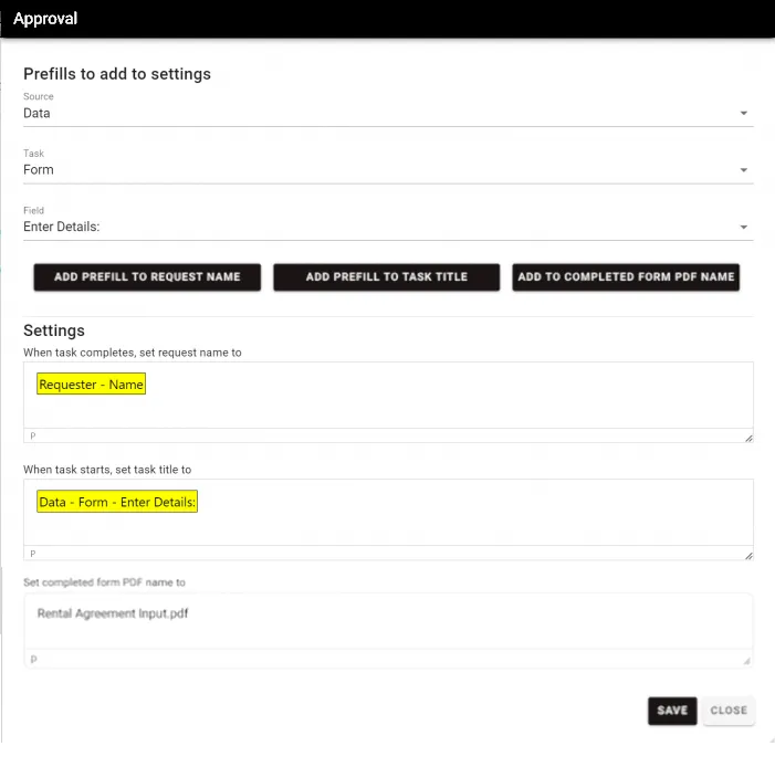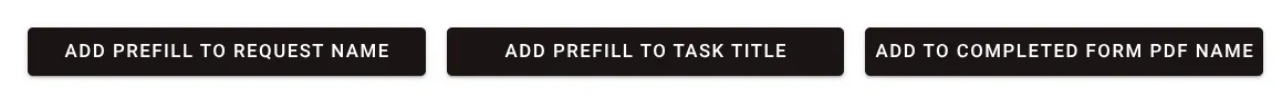 By selecting 'Add Prefill To Request Name ', 'Add Prefill To Task Title ', or 'Add To Completed Form PDF Name' you will see that the Dynamic Name will be applied to the option for: