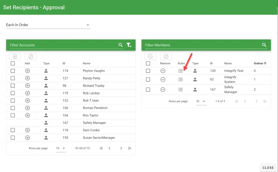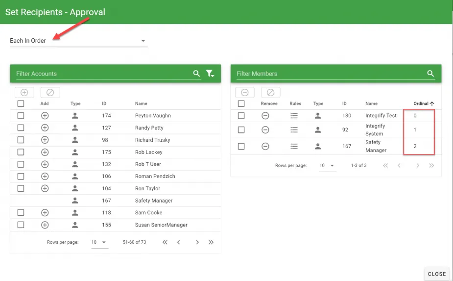 | Each in Order | Requires all Recipients to complete the task but it also allows defining the order in which those individuals are assigned to a task. |
