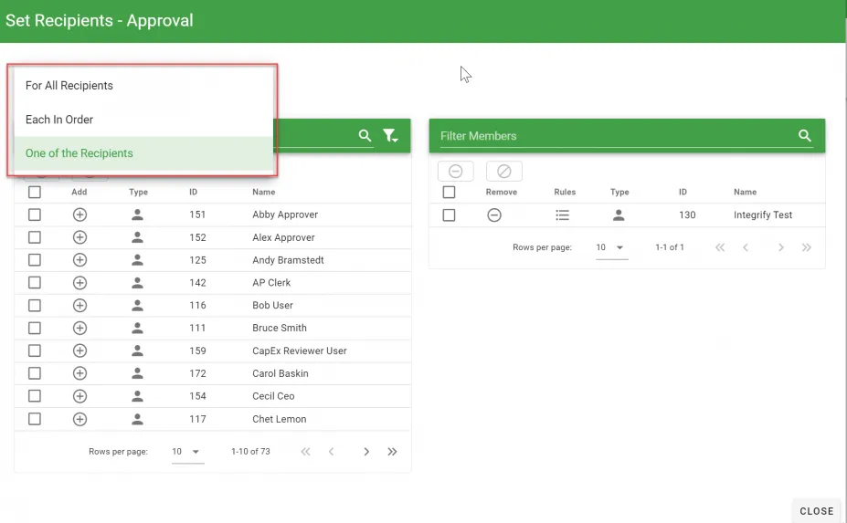 | One of the Recipients | The default option. Informs Integrify that only one Recipient needs to complete the task for the task to be marked as completed. |