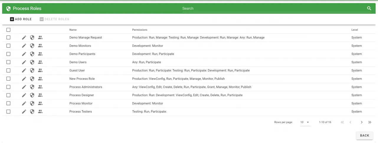 Allows Administrators to manage permissions and members of different roles (Administrators, Process Testers, Process Users).