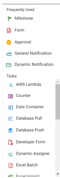 The Tasks menu will always be available for any Process in the left-side panel of the Process Builder canvas. From this menu, you can add a new task to your process. Simply click and drag a task to a position you want on the canvas.