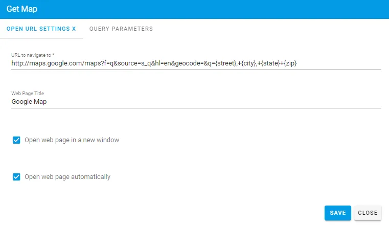 The Open URL task launches a specific URL as part of a process flow. The site can be launched in a new window and can reference remote or internal URLs. Also, data from the request can be passed using parameters.