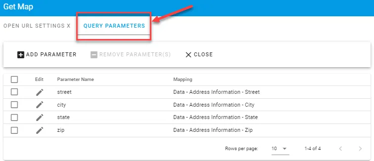Map each parameter to the source of the data within the request and click "Close " when complete.