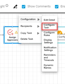Note that because the subsequent tasks need to be in place before you can configure the Task Assigner you will have to place it, continue building out the workflow, and then returning to configure it.