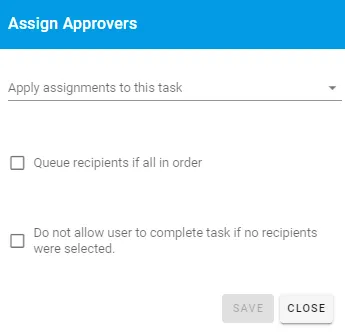 | Queue recipients if all in order | Slide Button | No | If you plan to assign multiple recipients and have them complete the task in a specific order turn this on. When selecting recipients in the next step, make sure to select "Each in Order" at the top of the Recipients dialog box. You'll then select the recipients in the order they should be assigned. |