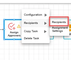 Hover over the Task Assigner and select "Recipients." You can then choose the users who will be assigned the subsequent task. In this case, we've selected two recipients (Bob User and Bruce Smith) and configured them to complete the task in the order we've selected them.