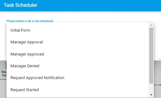 Note: By coupling the Task Scheduler with a Launch Request task type, users can schedule a new request (instance of a process) to start. You can also use the Form Assigner task type to allow users to schedule the start dates of future tasks. The only difference being is that this Task Scheduler allows the user to also choose the hour and time zone that the future task will start.