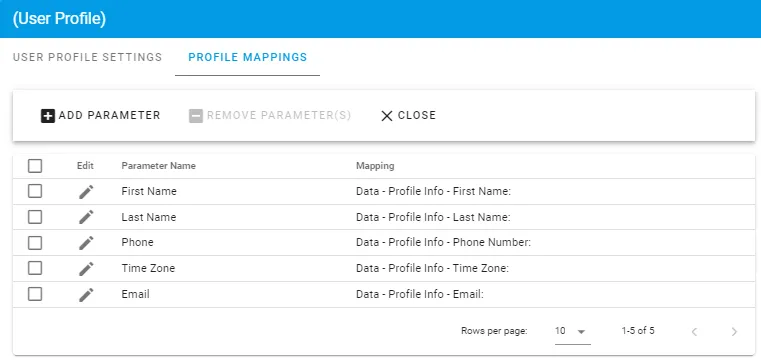 Then, select the Add Parameter button so you can start mapping which contact fields will be updated from the Profile Form. If you wish to create new user accounts, be sure to provide a default password by mapping a default password value from a short text question on the form to the Password attribute of the new user account.