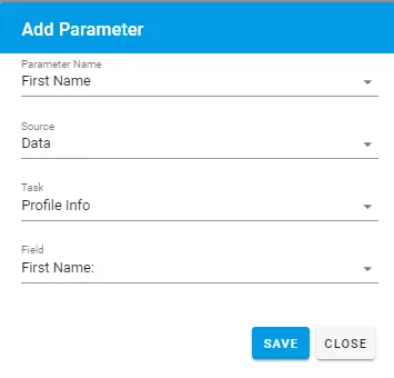 Now you can select a contact table field from 'Profile Attribute ' that will be updated and then the source information. In this case, under Source, we are selecting the Data from the Profile Info Form task, and selecting the First Name Field. Select 'Save ' to add the attribute parameter.