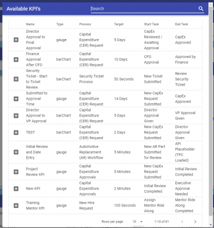 All KPIs defined for all processes are available to add to a Dashboard. See the section on creating Dashboards to learn how to create and configure Dashboards.