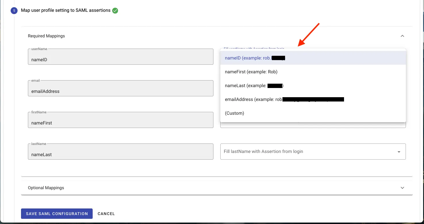 - Also in step 5 click on the drop-down boxes in the right-hand column to choose attribute claims found in the SAML assertion that match the required Integrify user profile values in the left-hand column. Click on “Optional Mappings” to expand the optional mappings section for optional user profile attributes.