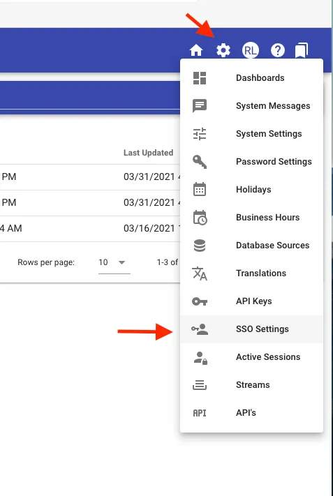 - In the upper right-hand corner hover over the Settings gear icon and select SSO Settings.