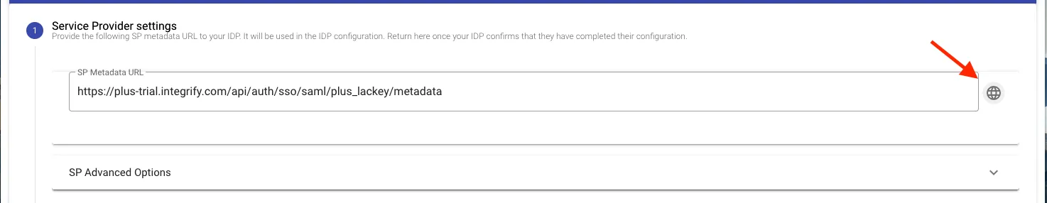 - On step 1 of the SSO Settings page click the globe icon to the right of the metadata link box which will open the metadata details in a new tab. Alternatively, copy and paste the metadata link into a new browser tab or window to open the metadata details. This will provide the ACS URL and entityID needed to configure the application on the Identity Provider side.